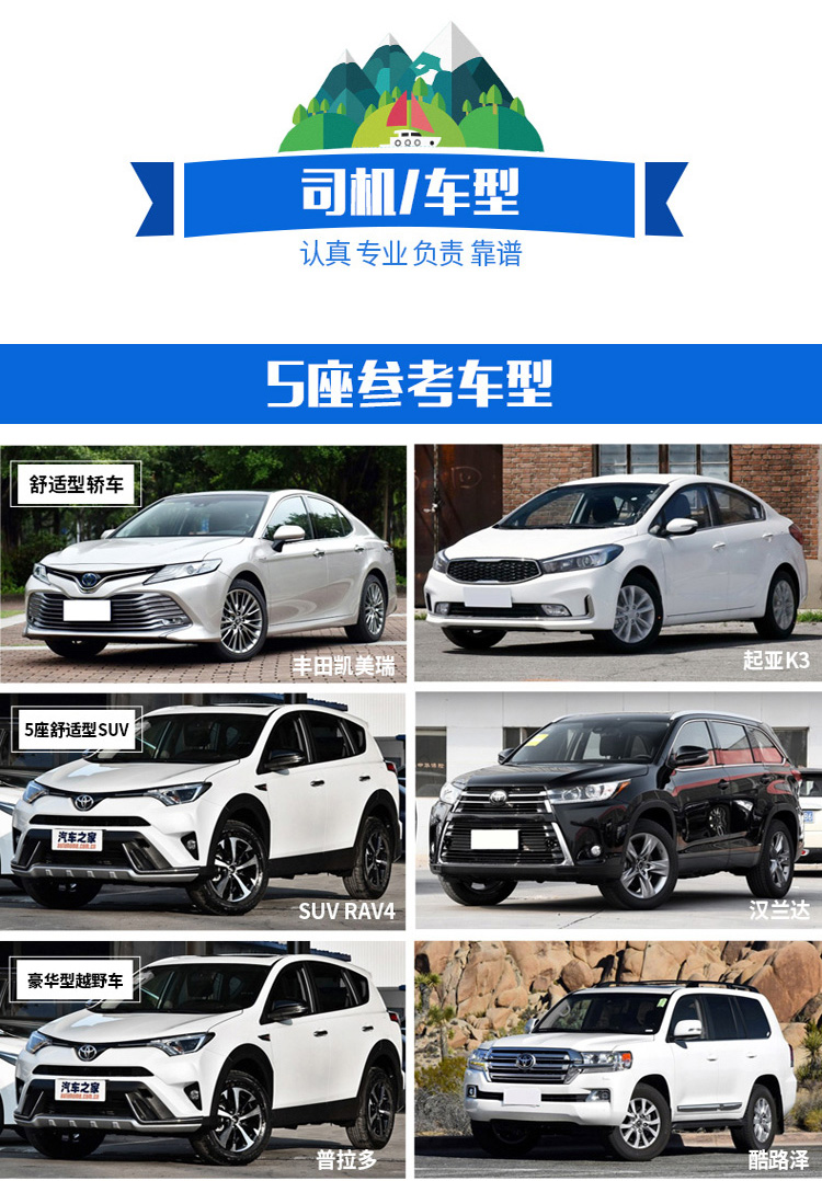 特別說明:車型不同,價格不同;季節(jié)不同,價格不同;網上價格僅供參考,親在預訂前請與我公司客服聯(lián)系,謝謝合作!