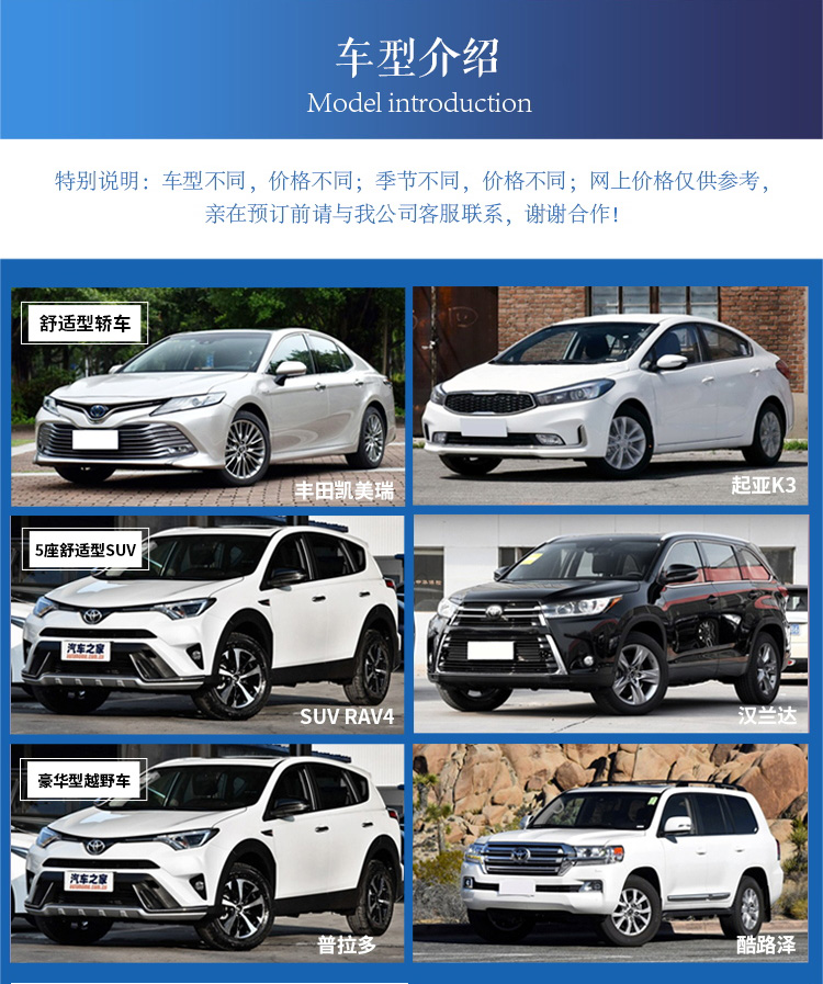 特別說明:車型不同,價(jià)格不同;季節(jié)不同,價(jià)格不同;網(wǎng)上價(jià)格僅供參考,親在預(yù)訂前請(qǐng)與我公司客服聯(lián)系,謝謝合作!